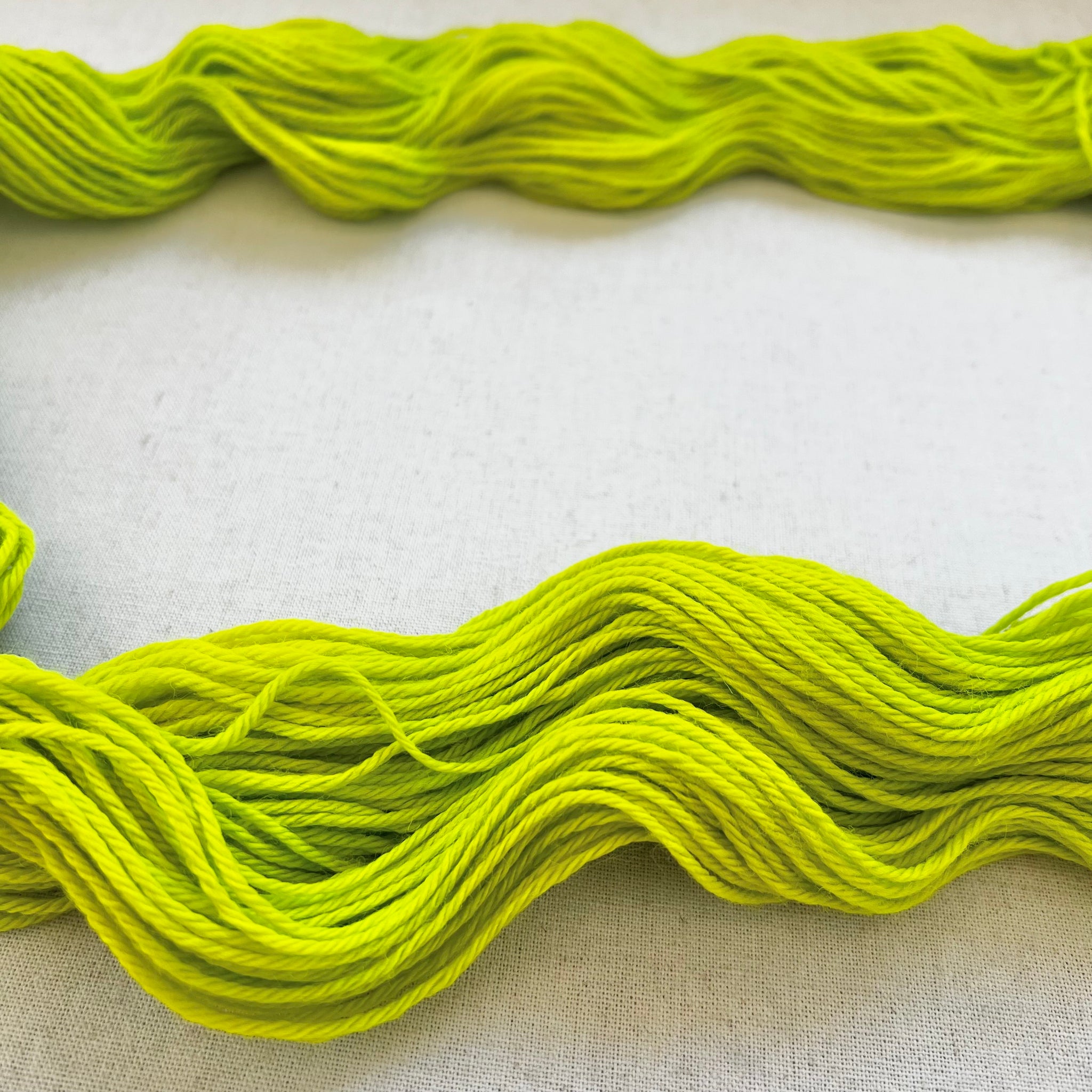 Merino wool DK weight yarn hand dyed in a OOAK (one-of-a-kind) variant (trial 1) of the Yarntuary colorway “Diet Mountain Dew”, inspired by the song by Lana Del Rey. In the end I decided to use the dye recipe for this variant as the final colorway.