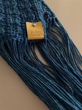 This cowl is a rustic stonewash blue with white accents and boho flair. The stitching on both sides is beautiful and modern. You can where it flipped either way you prefer. The texture in this scarf is unique and pretty.