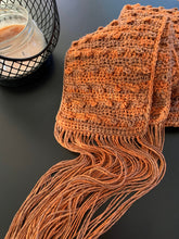 Golden sparkle runs throughout the entire scarf. It really shines in the sun and indoors too. The warm pumpkin color sends out happy fall vibes.